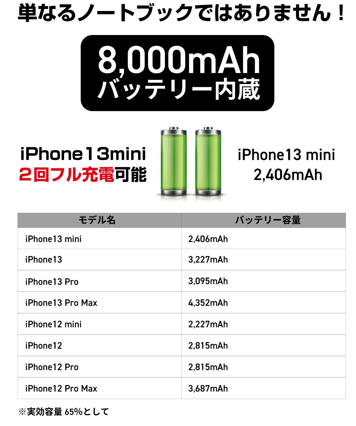・8,000mAhバッテリー内蔵(iPhone13mini:2回フル充電可能)